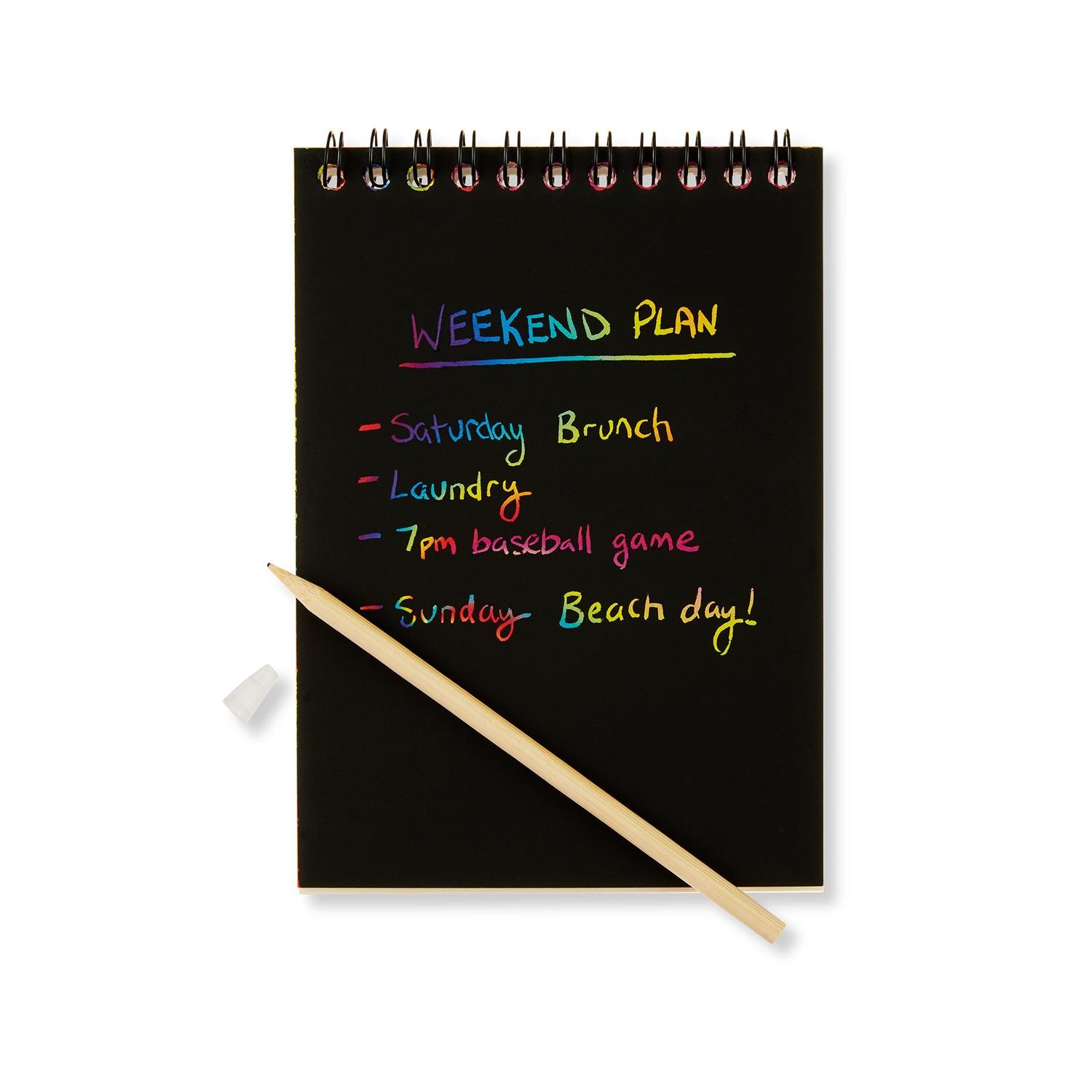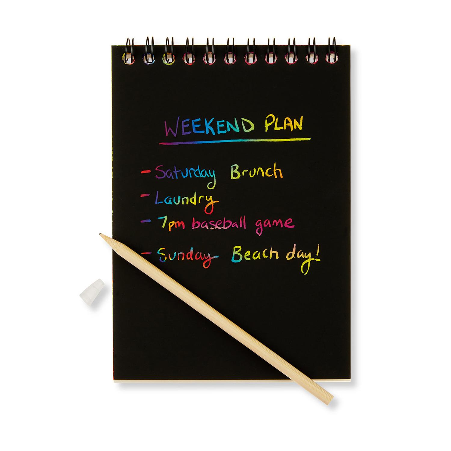 Enjoy adding a twist to the everyday with magic paper. Write, “scratch” or draw on the rainbow-colored sheets with black coating for a creative finish. 230G card paper 8 scratch sheets, clear Polypropylene Plastic cover (0.5mm), wire/spiral binding. Includes Bamboo stylus with Plastic cover. Also includes 8 plain white 90G paper sheets in back for traditional drawing. 4.0000″ W x 5.5000″ H x 0.1600″ D
